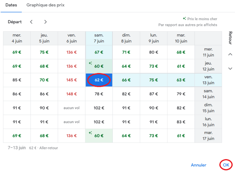Si vous avez des dates flexibles, vous pouvez utiliser aussi les fonctionnalités « Graphique des prix » et « Calendrier«
