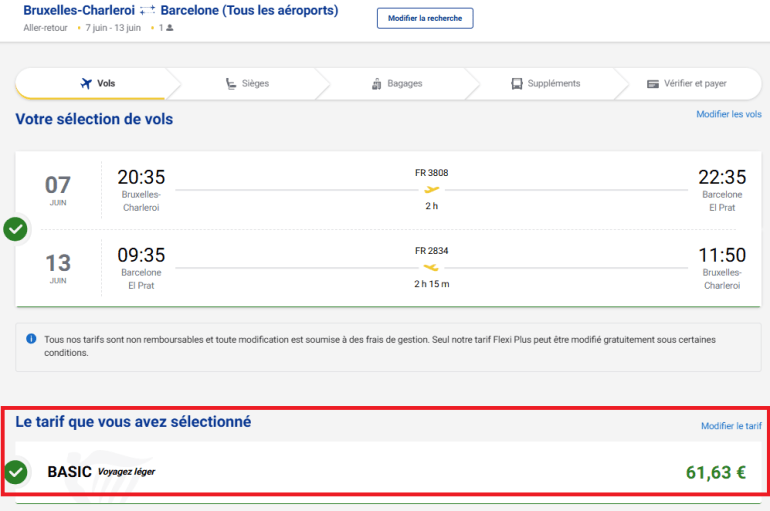 Toujours en prenant Ryanair comme exemple, vous pouvez choisir le tarif. Souvent le tarif affiché en premier et retrouvé par Google Flight est le tarif Basic (Sans bagages, sans choix de siège…). Vous pouvez adapter le tarif en fonction de votre besoin :