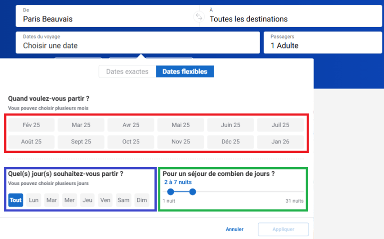 Vous pouvez adapter votre recherche en fonction de vos dates de voyage. Vous pouvez choisir :