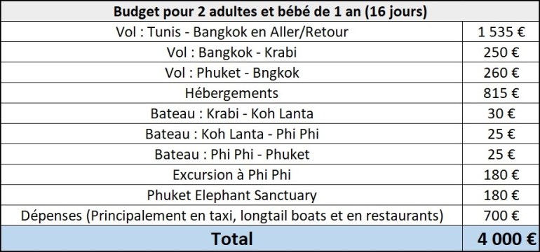 Notre Budget pour 2 adultes et un bébé de moins de 2 ans a été de 4000 € pour 16 jours (14 sur place) :