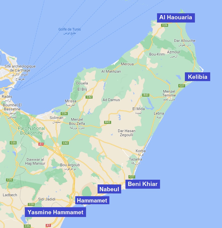 This region has a big diversity: you will find large cities (Nabeul and Hammamet), seaside tourist complexes (Hammamet, Yasmine Hammamet, Merezgua…) as well as magnificent fishing villages (Kelibia, Al Haouaria…).