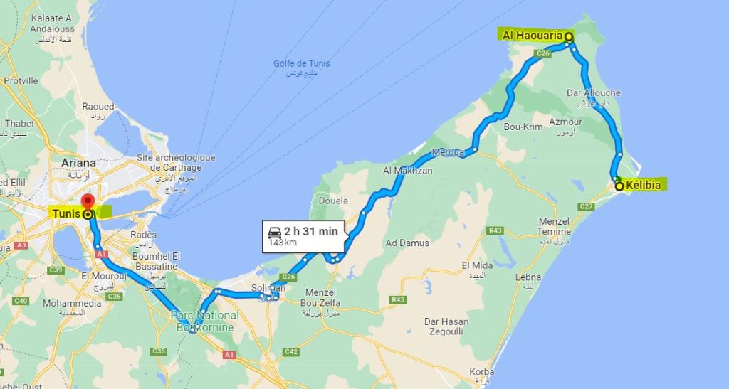 You can also make the trip by car via the highway. The price of tolls is very affordable in Tunisia (1.4 TND ~ 0.50 €) for the Tunis / Nabeul journey.