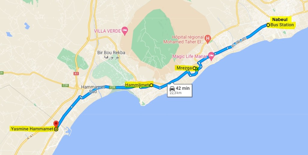 Hammamet is also accessible from Tunis by bus or collective Taxi, just like Nabeul with the same prices