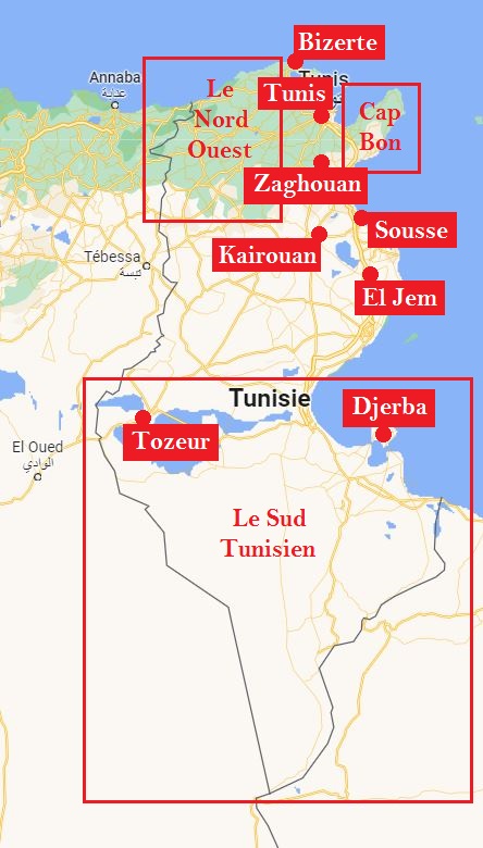 - Le Nord-Ouest : la région voisine de l’Algérie avec ses montagnes et ses villes historiques (Le Kef, Béja, Tabarka, Dougga, Ain Draham, Beni Mtir …)