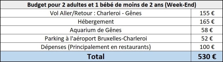 Notre Budget pour le week-end pour 2 adultes et un bébé de moins de 2 ans : 530 €