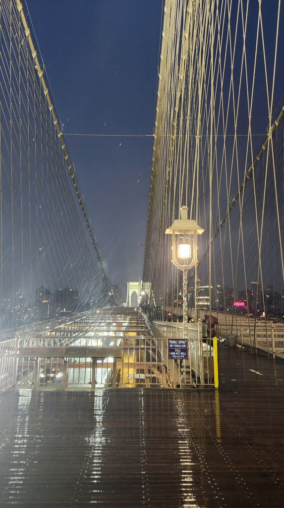 As soon as we start to cross the Brooklyn Bridge, a heavy rain forces us to return back.
