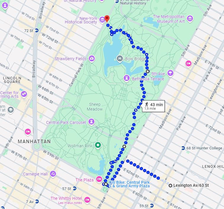 After a PATH/Subway connection, we arrive in New York at the « Lexington Av/63 St » station. After a short walk through the streets of Manhattan among the skyscrapers, we arrive at Central Park