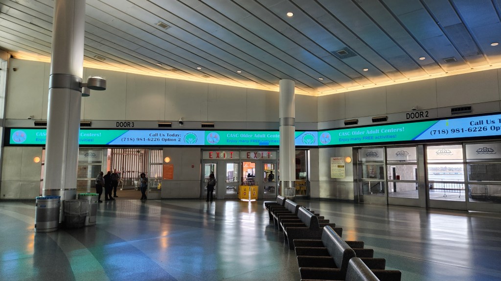 Pour le trajet retour, il n’est pas permis de rester à bord du ferry. Mais il est envisageable de descendre, repasser par la salle d’attente de Staten Island et remonter à bord du même bateau pour le retour.