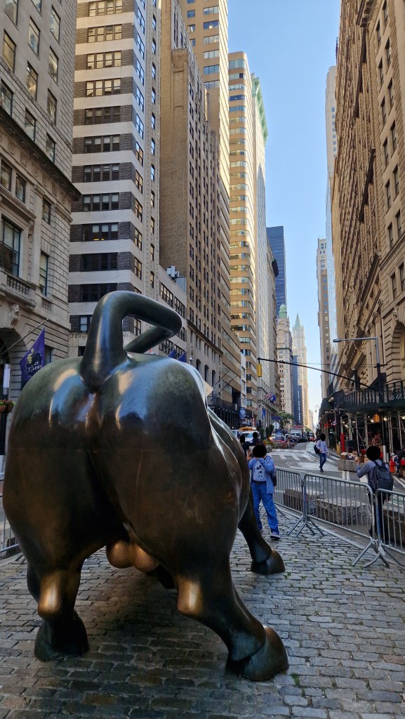 Dans le quartier de Wall Street, sur l’avenue Broadway, ne ratez pas le Taureau de Wall Street (Charging Bull). C’est une célèbre sculpture en bronze. Selon la tradition toucher les testicules du taureau apporte la fortune.
