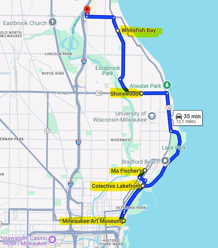 Vous pouvez prendre un café dans une adresse incontournable de la ville et commencer le tour : Colectivo Lakefront (43°03’12.4″N 87°53’12.6″W). Le lac et la corniche sont magnifiques. Nous continuons notre tour vers les quartier chic de « Shorewood » et « Whitefish Bay« . Nous finissons notre tour dans l’épicerie Trader Joe’s (43°07’07.9″N 87°54’58.9″W). Vous pouvez y découvrir des produits locaux si cela vous intérésse.
