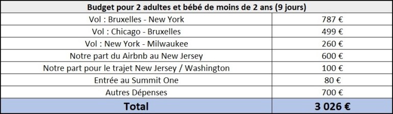 Notre Budget pour 2 adultes et un bébé de moins de 2 ans a été de 3 026 € pour 9 jours :